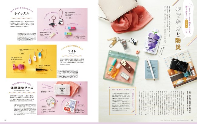 9月の防災の日にあわせて、どこであってもお<「サステナブルなあたらしい金沢」ページ例>かしくない地震、豪雨災害などに備えるため携帯したい防災グッズと避難の心得を指南する、巻末の『おでかけと防災』にも注目してください。