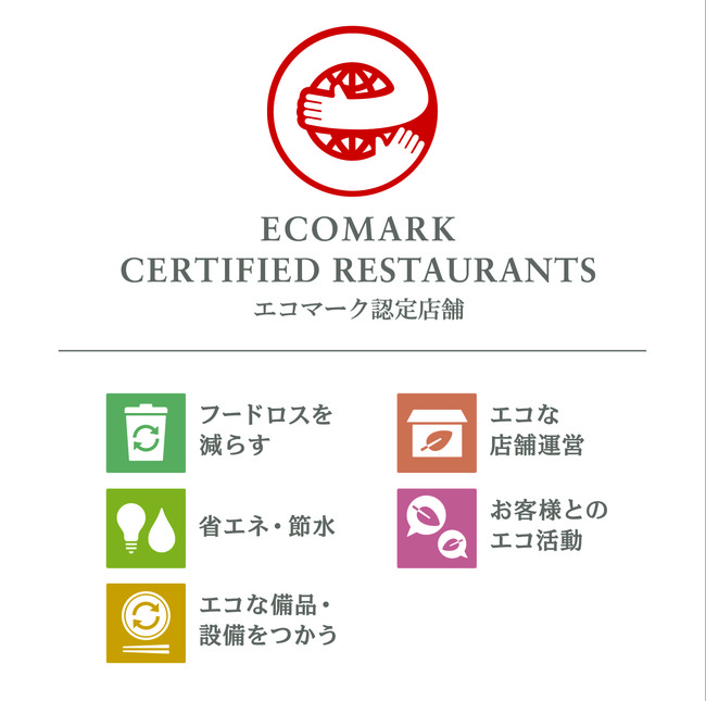 エコマークは環境への負荷が少ないなど、環境保全に役立つと認められる商品やサービスにつけられるラベルの呼称で、消費者が暮らしと環境の関係を考える上で、環境保全の面でより良い商品を選びやすくすることを目的としています。エコマークの「飲食店」認定基準は、6つの評価カテゴリーに分けられ、省エネ・節水などの基本的な環境対策に加えて、食材の環境配慮、食品ロス削減に向けた食べ残しが減るような啓発や運動などの、消費者の理解を深める取組みを評価しています。ワタミでは今回、6つの評価カテゴリーで全ての認定を受けました。