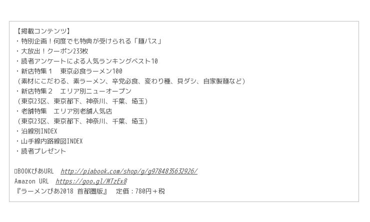 『ラーメンぴあ2018 首都圏版』 定価:780円+税
