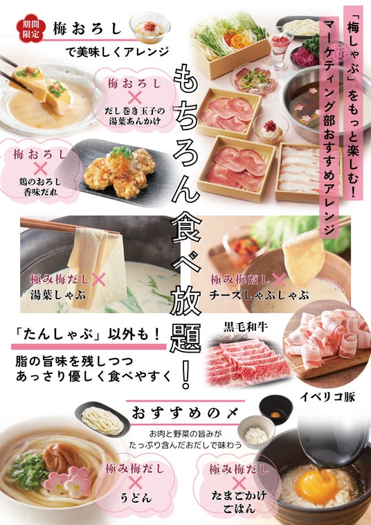 当日配布した「メディア向け資料」には、今年13年目となる「梅しゃぶ」のおだしへのこだわりの他、各季節限定メニューの詳細、温野菜マーケティング部オススメの「梅アレンジ」などを記載しています。