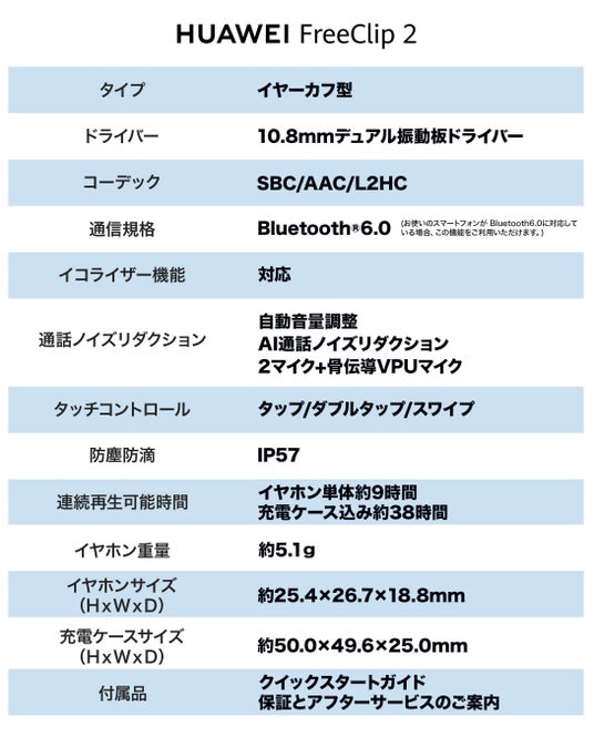 ※1:「デュアル振動板ドライバー」とは、『HUAWEI FreeClip 2』に搭載された、自社開発の2つの振動板をもつダイナミック型ドライバーユニットを指します。全てのデータは『HUAWEI FreeClip』との比較で、ファーウェイラボによる測定結果であり、実際の数値は製品や使用方法及び環境要因によって異なる場合があります。