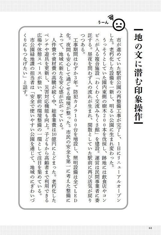 本書はSNSなどの普及を背景に「1億総炎上時代」となった現在、特に厳しい意見にさらされがちな「オールドメディア」の元記者が、自身の経験も踏まえながら嫌われる文章の例文を挙げ、解説と改善点を提示するものです。日常生活やビジネスシーンの何気ないやりとりからニュースや不祥事の際の謝罪文まで扱い、1項目4ページで読みやすく分かりやすい構成になっています。
