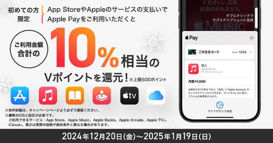 三井住友カード株式会社(本社:東京都江東区、代表取締役社長:大西 幸彦、以下:三井住友カード)は、2024年12月20日(金)より、対象カード限定で「【初めての方限定】App StoreやAppleのサービスの支払いでApple Payを利用すれば、ご利用金額合計のもれなく10%還元キャンペーン!」を開始します。