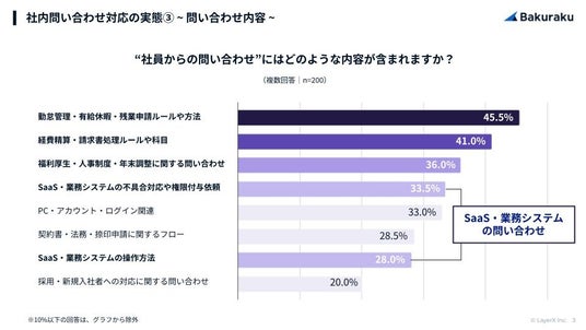 頻度が高い問い合わせ内容のTOP3は、1位「勤怠管理・有給休暇・残業申請のルールや方法(45.5%)」、2位「経費精算・請求書処理に関するルールや科目(41.0%)」、3位「福利厚生・人事制度・年末調整に関する問い合わせ(36.0%)」