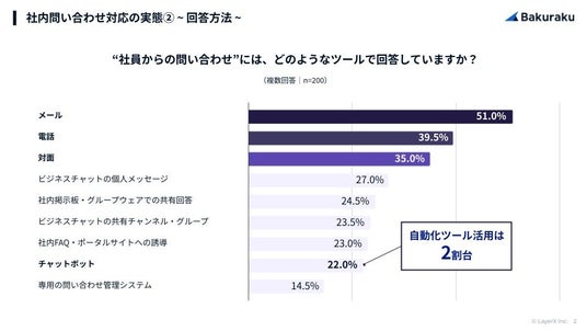 “社内問い合わせ”に対応するツールを質問したところ、1位は「メール」(51.0%)、次いで「電話」(39.5%)、「対面」(35.0%)でした。また、「チャットボット」による自動化ツールを活用していると回答したのは22.0%となりました。