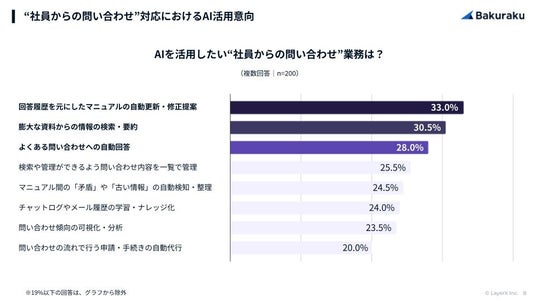 社内問い合わせにおいて、AIに任せたい業務TOP3は、1位「過去の回答履歴に基づくマニュアルの自動更新(33.0%)」、2位「膨大な資料からの情報検索・要約(30.5%)」、3位「よくある問い合わせへの自動回答(28.0%)」