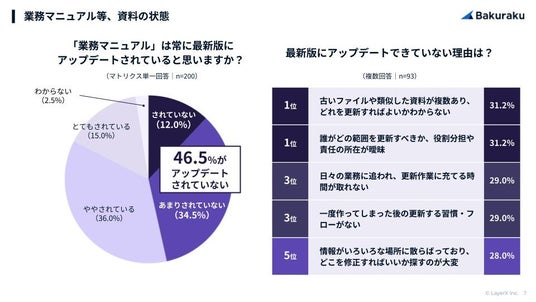 - 半数近くがマニュアルを最新版に更新していない。原因は「責任所在の曖昧さ」と「類似資料の混在」