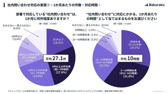 部署への問い合わせ件数は月平均27.1件、担当者の社内問い合わせ対応業務にかかる時間は月平均10時間。主な回答手段1位「メール(51.0%)」、2位「電話(39.5%)」、3位「対面(35.0%)」となり、チャットボット等の自動化ツールの利用は2割台に留まる