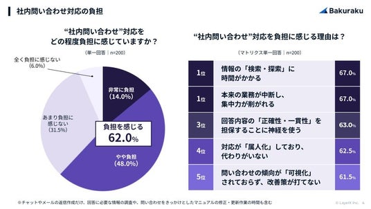 バックオフィス担当者の62.0%が社内問い合わせ対応を「負担」と回答。負担を感じる理由は「情報の検索(67.0%)」と、「本来業務が中断され、集中力が削がれる(67.0%)」が同率1位