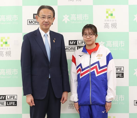令和7年3月17日(月曜日)、高槻市立第十中学校3年生の山崎瑠花さんが市役所を訪問し、3月20日(木曜日)から23日(日曜日)まで東京都で開催される「第100回日本選手権水泳競技大会」の200メートル自由形(女子)に出場することを濱田剛史市長に報告しました。