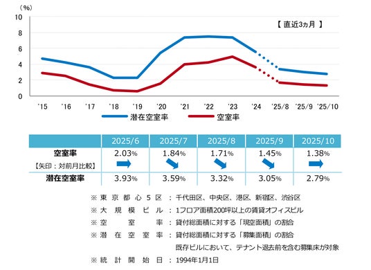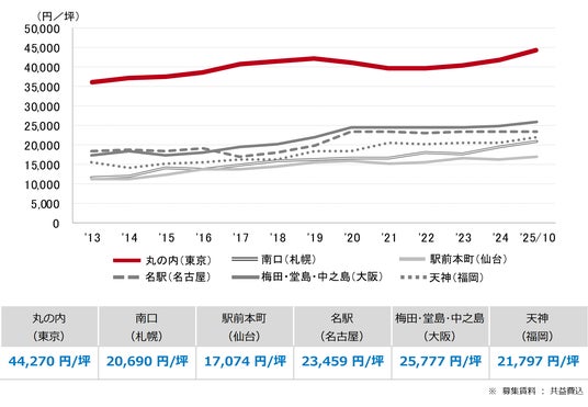 三幸エステート株式会社(本社:東京都中央区、取締役社長:福島正二郎)は、2025年10月度の東京都心5区(千代田区、中央区、港区、新宿区、渋谷区)および全国6大都市(東京、札幌、仙台、名古屋、大阪、福岡)の大規模ビル※1のマーケットデータをまとめた「オフィスマーケット2025年11月号」を公表します。