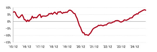 募集賃料の対前年同月比は、2024年2月から21ヵ月連続でプラスとなった。2025年9月のプラス幅は8.4%で、コロナ禍前の直近のピークであった2020年3月の水準を上回っている。対前年同月比のトレンドは比較的安定しているため、上昇傾向は今後も続くと考えられる。