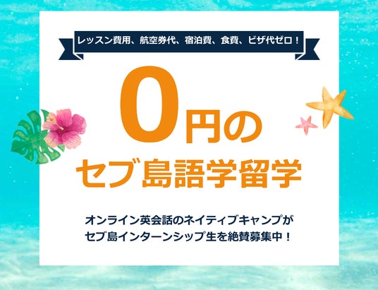 セブ島でのインターンシップ生を募集しています。サービス運営を手伝っていただく代わりに、留学でかかる諸費用をネイティブキャンプがサポートいたします。通常の留学にかかる諸費用を0円にすることで「海外で挑戦したい」「英語を習得したい」という意志を最大限サポートいたします。