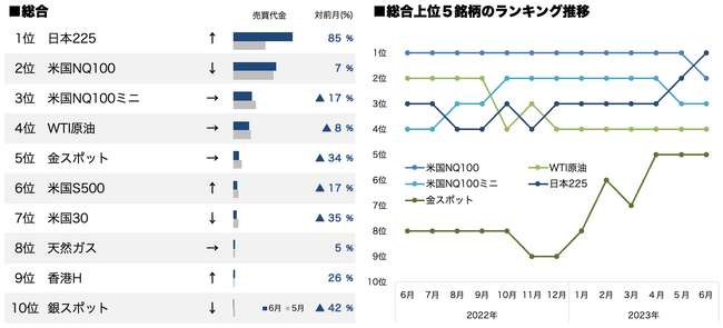 2023年6月のCFD売買代金ランキングは、日経平均株価が33年ぶりの高値を連日で更新するなど高水準で推移したことから、5月に引き続き売買代金が伸長した「日本225」が総合ランキング首位となりました。また、米国株式市場で過去最長の連騰を記録した「テスラ」の売買代金が前月比2倍以上と大きく増加し、外国株ランキング1位にランクインしました。