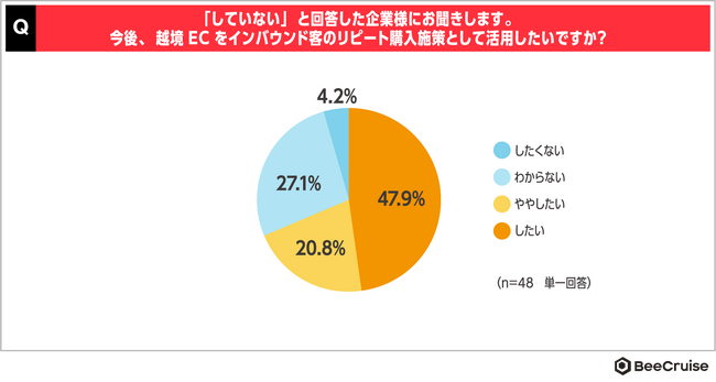 続けて、「今後、越境ECをインバウンド客のリピート施策として活用したいですか?」(単一回答)と聞いたところ、「したい」が最多で47.9%、「ややしたい」が20.8%となりました。およそ7割の企業に越境ECの活用意向があることがわかりました。