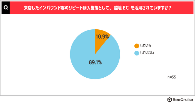 「来店したインバウンド客のリピート購入施策として、越境EC を活用されていますか?」(単一回答)では、「している」が10.9%、「していない」が89.1%となりました。越境ECの活用意向はあるものの、まだ導入は進んでいないことがわかりました。