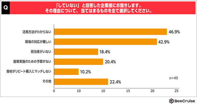 「来店したインバウンド客のリピート購入施策として、越境EC を活用していない」と回答された企業に、その理由について聞いたところ(複数回答)、「活用方法がわからない」が最多で46.9%となりました。僅差で「現場の対応が難しい」が42.9%が次点となりました。越境ECの活用や運用方法に課題を感じていることがわかります。