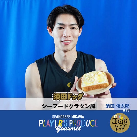 須田ドッグ(シーフードグラタン風)#13 須田侑太郎選手の好きな食べ物はグラタン!シーフードの旨味とこだわりの米粉PANでグラタン風に仕上げました。