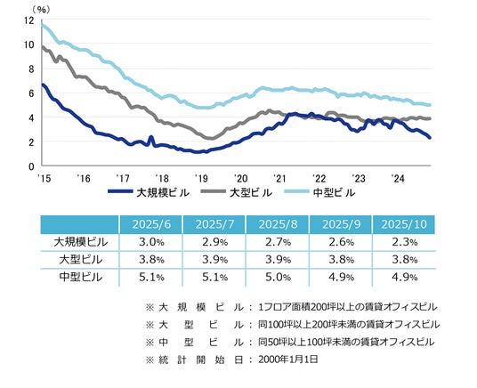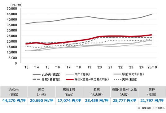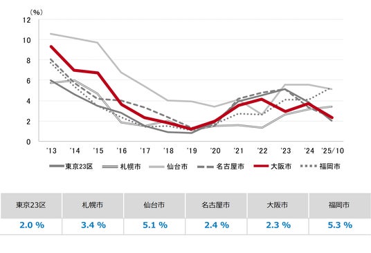 三幸エステート株式会社(本社:東京都中央区、取締役社長:福島正二郎)は、2025年10月度の大阪市オフィス賃貸状況(空室率&現空面積:大規模、募集賃料&募集面積:大規模、規模別空室率、主要3区※1空室率:大規模)および全国6大都市(東京・札幌・仙台・名古屋・大阪・福岡)の大規模ビルのマーケットデータをまとめた「オフィスマーケット2025年11月号大阪」を公表します。