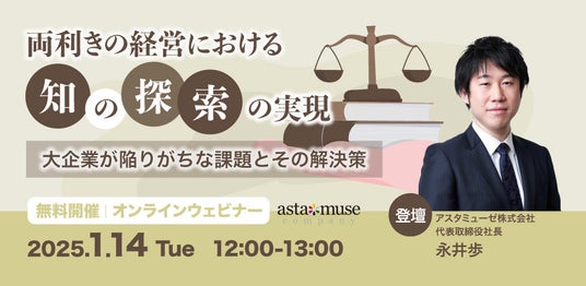 アスタミューゼ株式会社(本社:東京都千代田区、代表取締役社長 永井歩)は、2025年1月14日(火)12:00-13:00に、無料ウェビナー「両利きの経営における「知の探索」の実現 ~大企業が陥りがちな課題とその解決策~」を開催いたします。