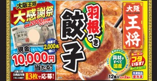 株式会社イートアンドフーズ(東京ヘッドオフィス:東京都品川区 代表取締役社長:仲田浩康)は2022年5月より、大阪王将ブランドの商品3パックの購入で応募でき、抽選で2,000名様に現金10,000円が当たるキャンペーン「大阪王将 大感謝祭」を開催いたします。