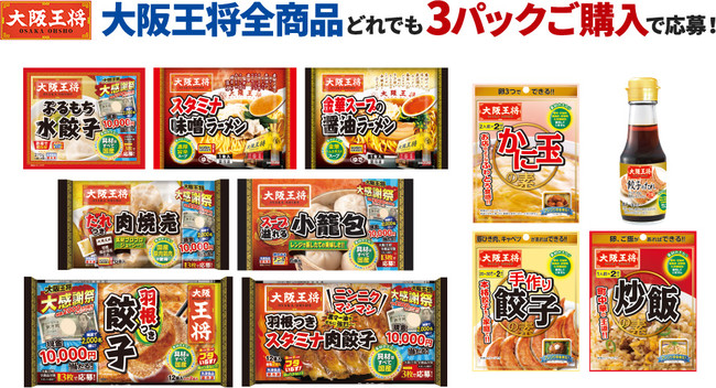 全国の量販店で販売されている大阪王将ブランドの全商品を対象に、3パックの購入でどなたでも応募が可能です。