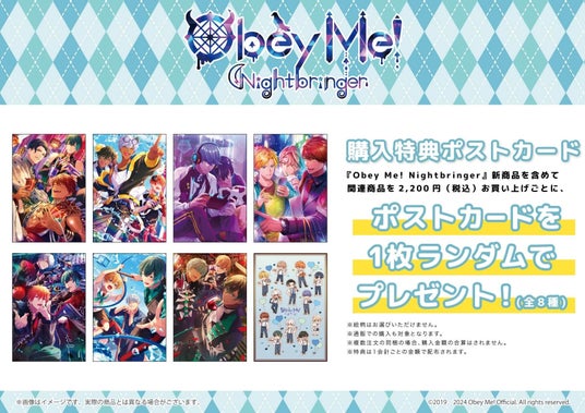 『Obey Me! Nightbringer』の新作グッズを含む関連商品を2,200円(税込)以上お買い上げごとに、ポストカード(全8種)をランダムで1枚プレゼント。