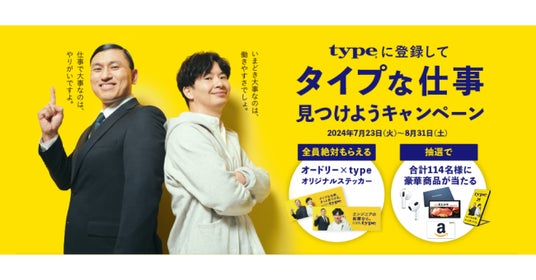 株式会社キャリアデザインセンター(本社:東京都港区、代表取締役社長兼会長:多田弘實)が運営する総合転職サイト『type( https://type.jp )』は、typeに登録して、タイプな仕事見つけようキャンペーン(特設サイト https://type.jp/s/number1/)を実施いたします。