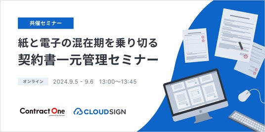本セミナーでは、契約データベース「Contract One(コントラクトワン)」を提供する当社と、電子契約サービス「クラウドサイン(R)︎」を提供する弁護士ドットコムより、紙と電子が混在する契約書の理想的な管理方法や、契約書データを活用することで生産性を向上させるコツについてご説明します。