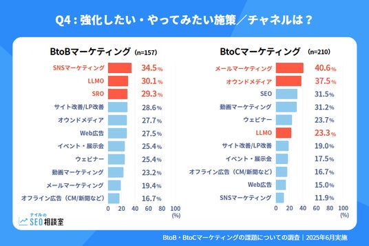 また、「LLMO(生成AIを活用した施策の最適化)」が30.1%と高く、BtoC(23.3%)よりも強化意欲が高い結果となりました。