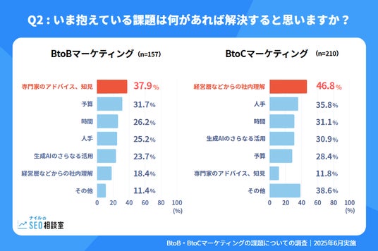 一方、BtoC企業では「経営層などからの社内理解」(46.8%)が最も多く、現場のマーケティング担当者が“社内を動かせない”もどかしさを感じている実態が浮かび上がります。