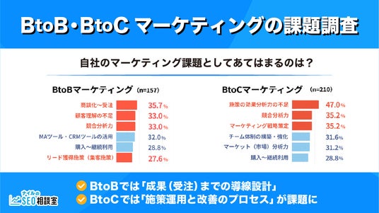 総じて、BtoBでは「成果(受注)までの導線設計」、BtoCでは「施策運用と改善のプロセス」に課題が集中しており、それぞれが直面する“壁”の位置が異なることが示された結果となりました。