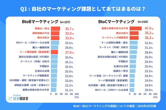 DX&マーケティング事業を展開するナイル株式会社(本社:東京都品川区、代表取締役社長:高橋飛翔、以下「ナイル」)は、企業のデジタルマーケティング従事者541名を対象に、BtoB企業・BtoC企業それぞれが抱えているマーケティング課題に関するアンケート調査を実施しました。