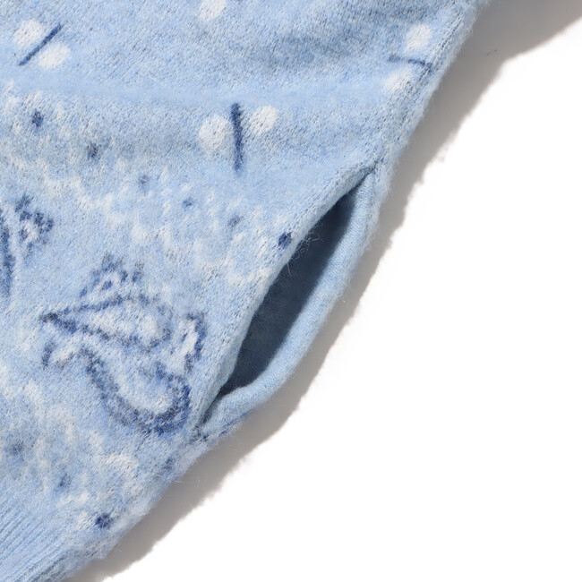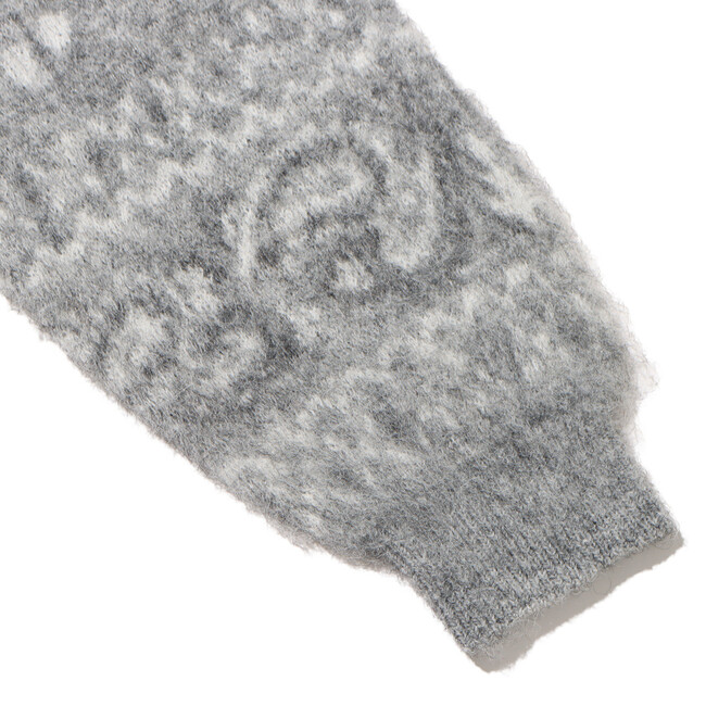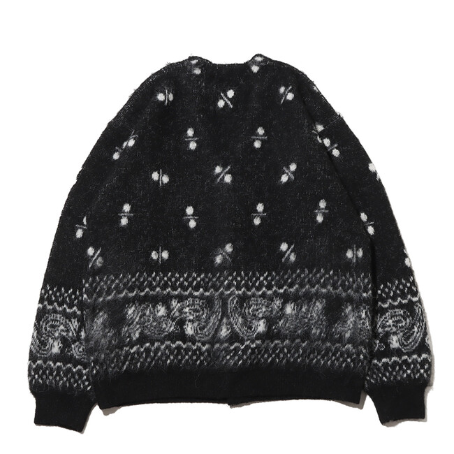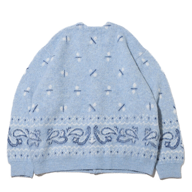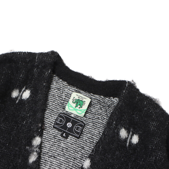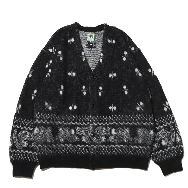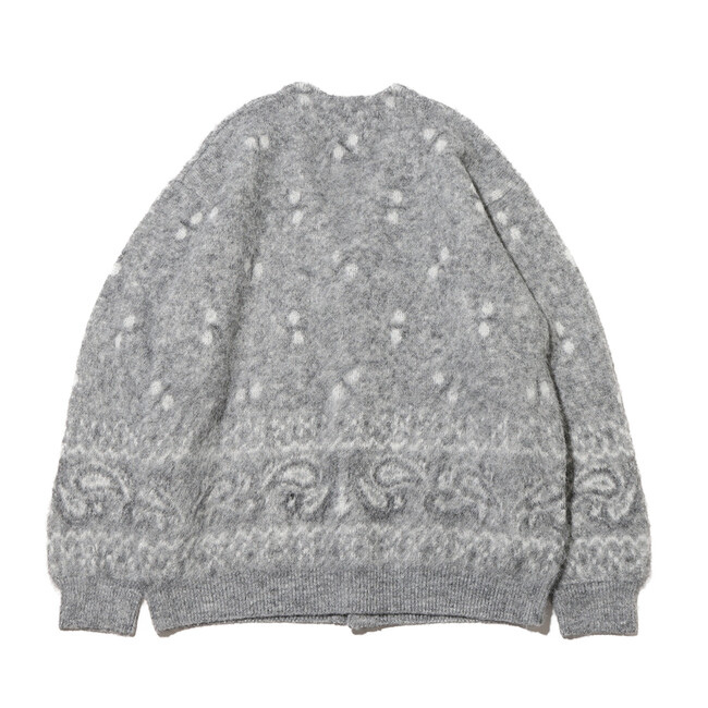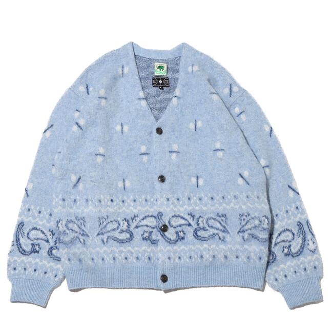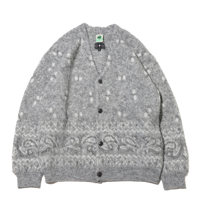 今回も「エレファント ブランド」とタッグを組み、60年代のヴィンテージバンダナの柄を書き下ろしたジャガード編みのカーディガンを展開。ディテールは、60~70年代に見られるカーディガンをイメージした温故知新なルックスに仕上げ、素材には、ミドルゲージのモヘア調によるウール混の糸を使用してふわふわとしたソフトな着心地を実現。さらに、シャギー加工を施して毛足を立たせています。