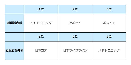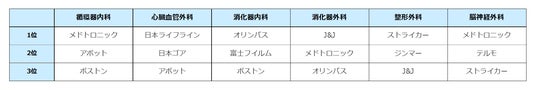 - 医師の印象に残っている医療機器メーカーのランキングTOP3(※1)は「心臓血管外科」「消化器外科」に変化