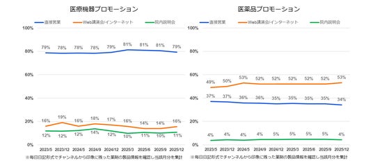 また、「製薬企業のプロモーション活動」を日記形式で確認している調査Impact Track(※3)においても、今回の医療機器の調査対象セグメント(6診療科・200床以上)に合わせて算出したところ、「医療機器の製品情報の入手状況」同様、2025年9月の調査と比較して大きな変化は見られませんでした。