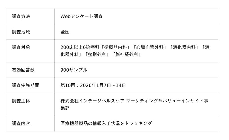全国の医師900人を対象に医療機器に関する製品情報の入手状況を調査しています。2022年12月(第1回)より継続的に実施しており、2025年12月度の調査結果で10回目となります。