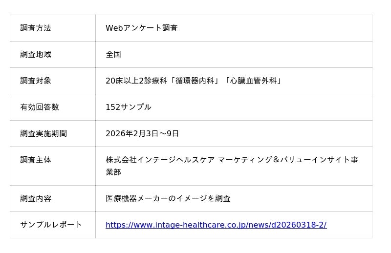株式会社インテージヘルスケア(本社:東京都千代田区、代表取締役社長:村井啓太)は、医療機器に関する製品情報の入手状況を調査した「医療機器プロモーショントラッキング」と、心臓血管領域の医療機器メーカーの製品力やサポート力を調査した「心臓血管外科領域の戦略的ブランドベンチマーク調査」を行いました。
