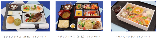 一. 機内食では、当チャーター限定で開発された”サンジ監修”スペシャルメニューをご提供します。ビジネスクラスの洋食は「”骨つき肉”をイメージしたハンバーグ」、和食は「おでんとすき焼き」、エコノミークラスは「彩りちらしとお蕎麦」をメイン料理としています。テレビアニメで放送中の”ワノ国編”の世界観を感じていただけるメニューをご堪能ください。