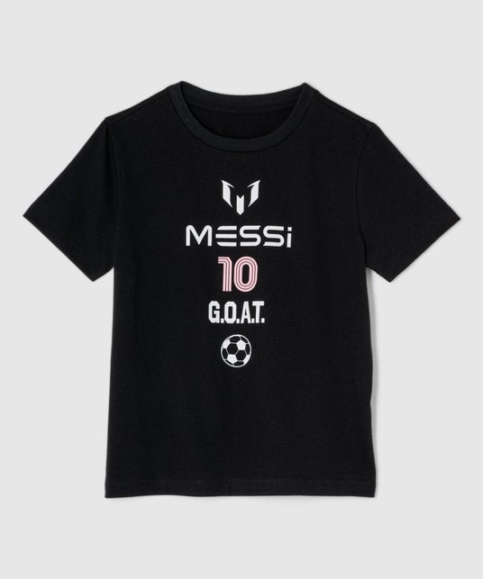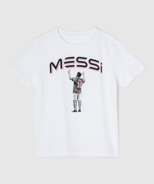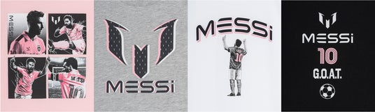 本コラボTシャツは、メッシが所属しているインテル・マイアミCFのホームユニホームカラーであるピンクをアクセントにした4種類のTシャツがラインナップ。躍動的なメッシのパフォーマンスシーンを描いたグラフィックや、ゴールパフォーマンスをしているメッシ、シグネチャーのロゴプリント、背番号である「10」と史上最高という意味である「G.O.A.T」の文字が施されたデザインのTシャツが全4種並びます。ボーイズカテゴリーで展開し、サイズは110~160cm、価格は全て4,490円(税込)です。