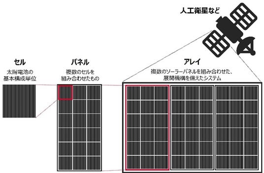 ※1 ソーラーアレイ:複数のソーラーパネルを組み合わせた、展開機構(打ち上げ時に収納された構造物が宇宙空間で所定の形状に広がるための機能)を備えたシステム。太陽電池全体の構成単位の中で最大の単位。