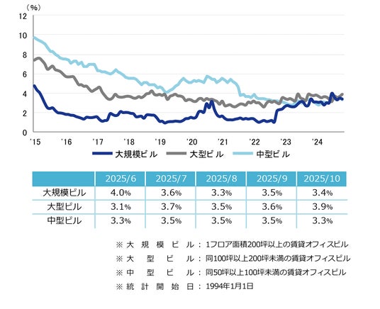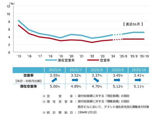 空室率は前月比マイナス0.04ポイントの3.41%と、前月から小幅な低下となった。新築ビルへ移転したテナントの二次空室が生じた一方、館内増床や一時需要等で空室消化が進み、前月からはわずかな動きとなった。潜在空室率は前月比マイナス0.01ポイントの5.11%となり、前月からほぼ横ばいだった。