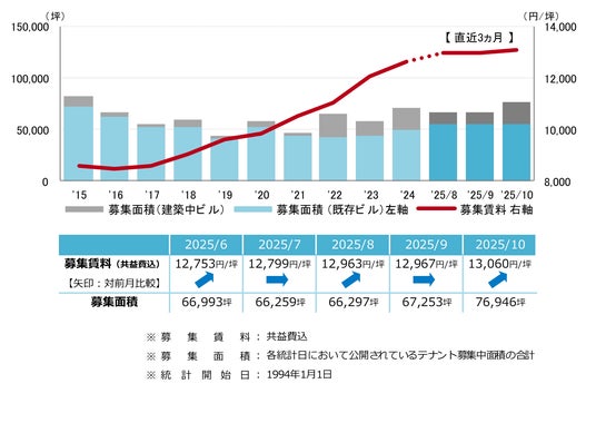 募集賃料は前月比プラス93円/坪の13,060円/坪と、5ヵ月連続の上昇となり、統計開始以来の最高値更新が続いている。