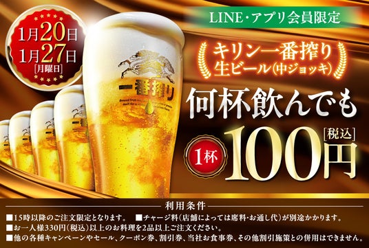 【1月20日、1月27日】の2日間は、LINE・アプリ会員様限定で生ビール何杯飲んでも1杯100円セール!