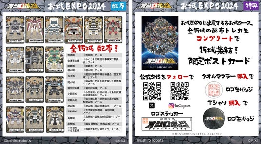 各お城ブースで全15城のトレーディングカードを配布します。その配布トレカをコンプリートし、オシロボッツブースで提示すると「15城集結!限定ポストカード」をプレゼントします。また、SNSのフォローや、タオルマフラー、Tシャツの購入でステッカー、ロゴ缶バッジをそれぞれプレゼントします。