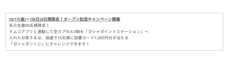ナムコアプリからご来店時のチェックインや、空カプセル回収のご協力で、ポイントやスタンプをためて、プレゼント抽選の応募やクーポン券に使用することができます。アプリでは商品の入荷状況や、在庫状況も確認できます。