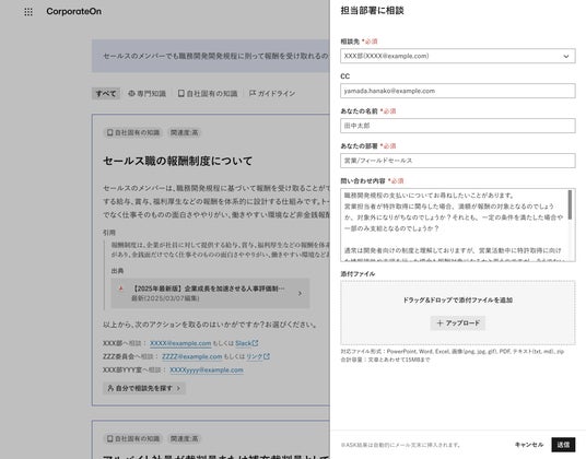 今回「CorporateOn」では、ユーザーの質問への回答について、AIが適切な相談先部署を画面上にサジェストする機能を実装しました。さらに、表示された相談先部署へ「CorporateOn」の画面から直接相談内容を送信できるようになりました。