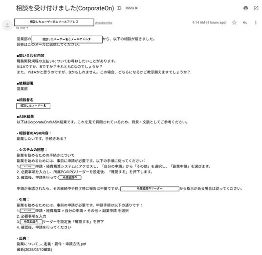 相談者が質問を送信すると、受け付けたコーポレート部門はメールで受信することが可能です。受信画面は以下の通りで、相談者による質問内容に加えて、「CorporateOn」による一次回答の内容や回答の引用情報も併せて受信できます。これにより、相談を受け付けた担当部門も「CorporateOn」がどのような回答をしたのかを把握でき、一次回答の補足のための参照が可能です。