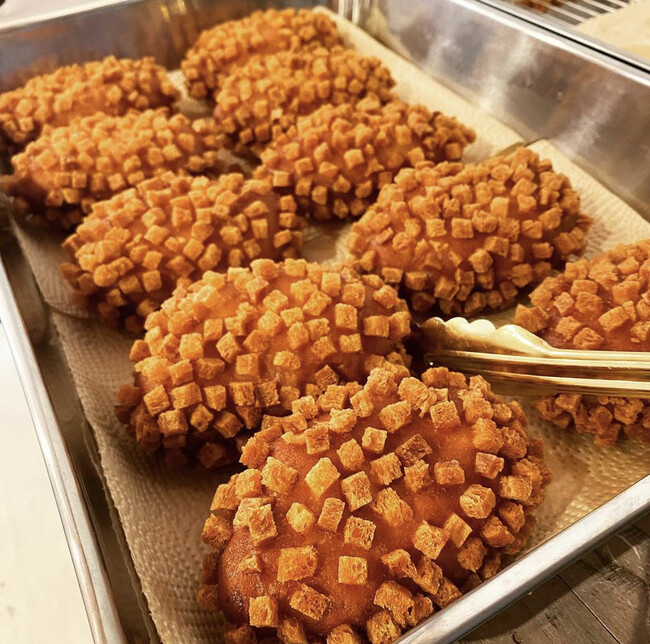 【小麦の奴隷】の看板商品である「ザックザクカレーパン」は、パンの周囲全てにクルトンを貼り付けて揚げるカレーパンで、ザクザクな食感が想像できる見た目にも注目です。一口食べると香ばしくザックザクとした心地良い食感がクセになります。中には特製スパイスを使用したルーとごろっとしたジャガイモがたっぷり詰められており、独自開発したもっちりとした生地は冷めても美味しいと評判です。