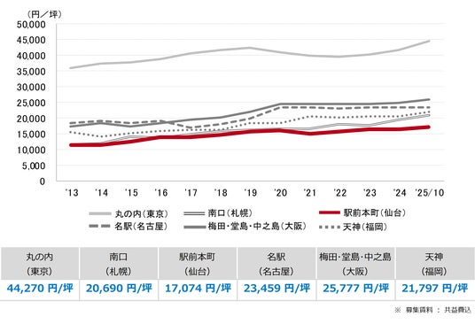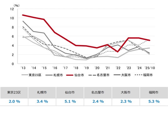 三幸エステート株式会社(本社:東京都中央区、取締役社長:福島正二郎)は、2025年10月度の仙台市オフィス賃貸状況(空室率&現空面積:全規模、募集賃料&募集面積:全規模、規模別空室率、主要エリア※1空室率:全規模)および全国6大都市(東京・札幌・仙台・名古屋・大阪・福岡)の大規模ビルのマーケットデータをまとめた「オフィスマーケット2025年11月号仙台」を公表します。